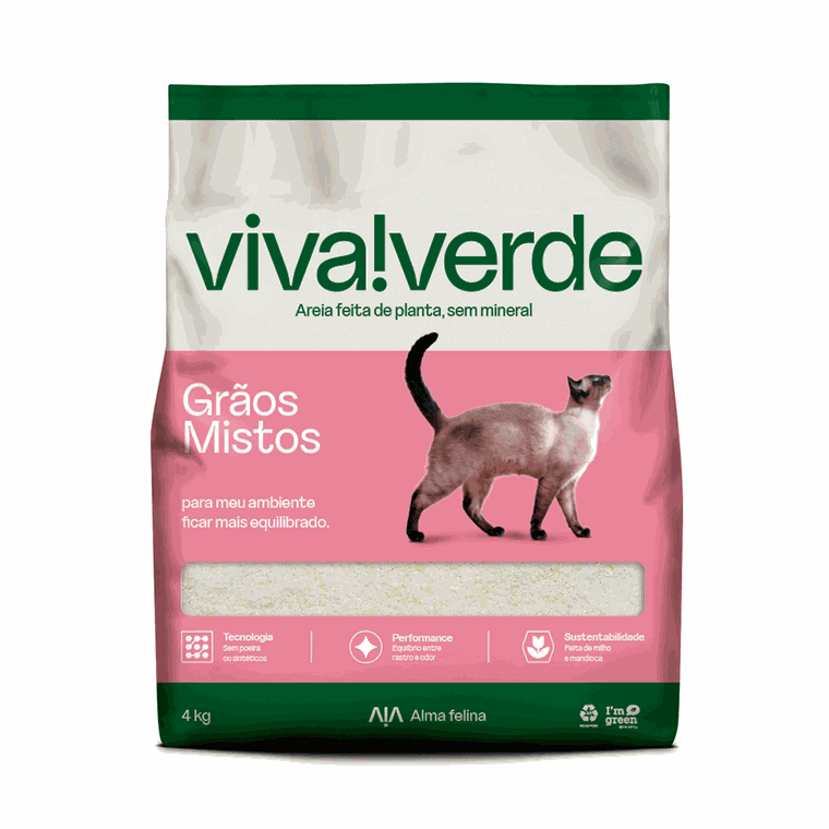 Dê ao seu gato o conforto que ele merece com a Areia Viva Verde Grãos Mistos – higiene natural, prática e eficiente!