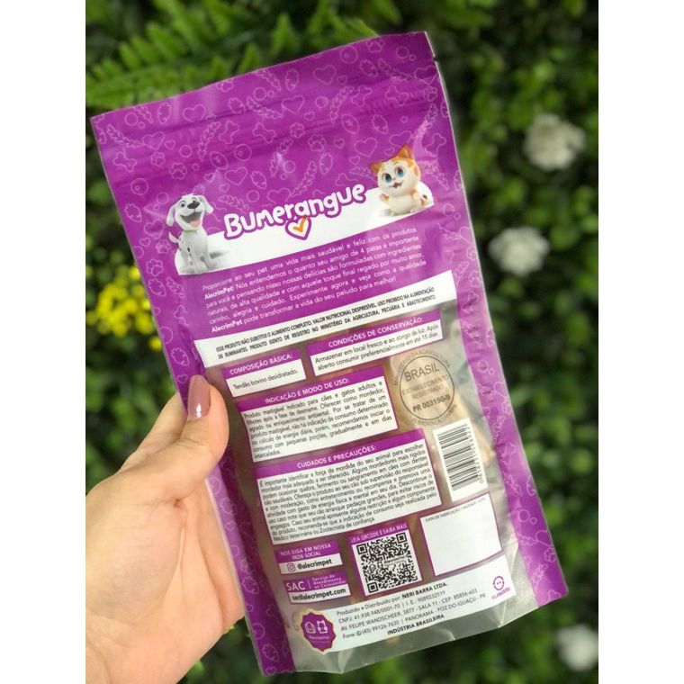 O Bumerangue é um mordedor natural produzido do tendão bovino desidratado. É recomendado para cães de todos os portes e idades, filhotes após a fase de desmame. Este mordedor foi naturalmente desenvolvido para manter seu cão de qualquer idade ocupado sem fazer travessuras.